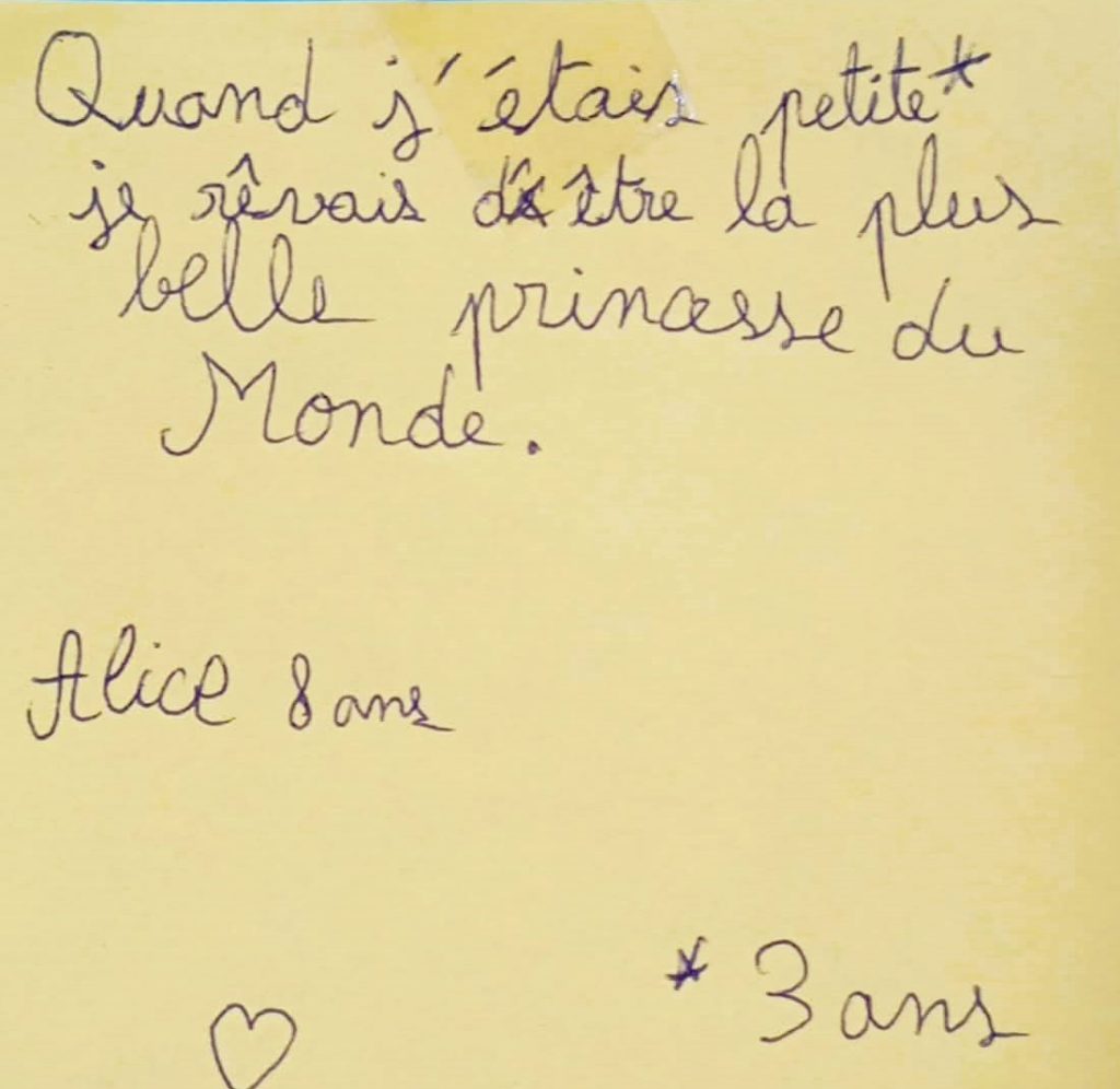 Et une petite fille de huit ans m’a demandé si elle pouvait, elle aussi, écrire son rêve : « Quand j’étais petite (à 3 ans) je rêvais d’être la plus belle princesse du monde ! »